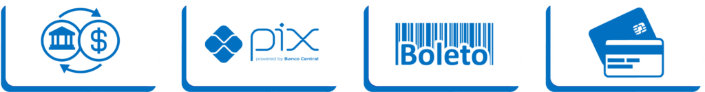 Pagamento através de transferência bancária, Pix, boleto bancário e cartão de crédito
